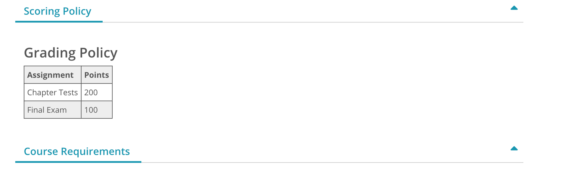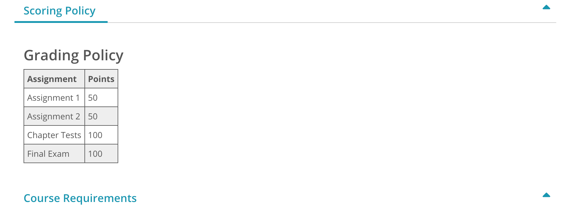 Some other courses are 33% Assignment 33% Chapter Tests and 33% Final Exam.